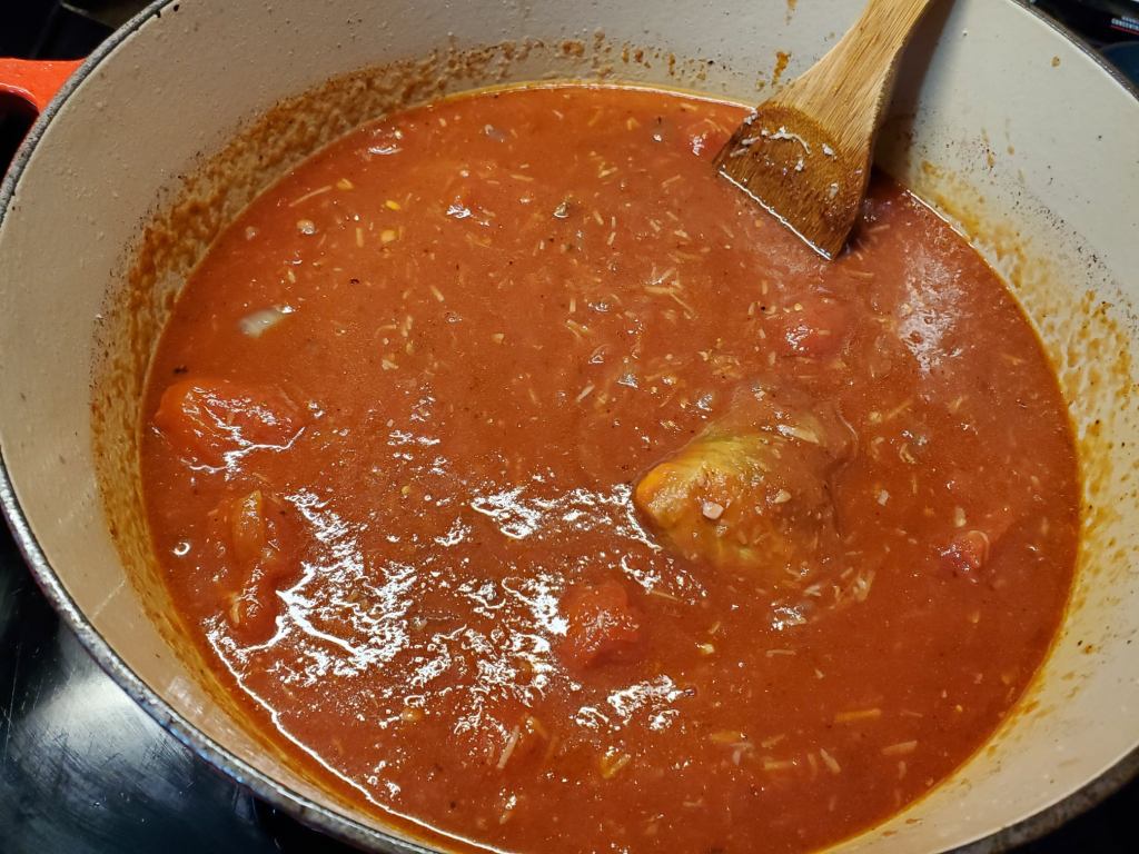Then add your canned tomatoes. The number of cans you use will obviously depend on how much gravy you want to make. I prefer to cook gravy on the weekend and make enough for the entire week. This will generally require two 28-ounce cans of tomatoes and sometimes I’ll add a third, smaller can. That depends largely on how much and what kind of meat I’ll be using. You want your meat covered by the sauce so it braises well throughout the process.