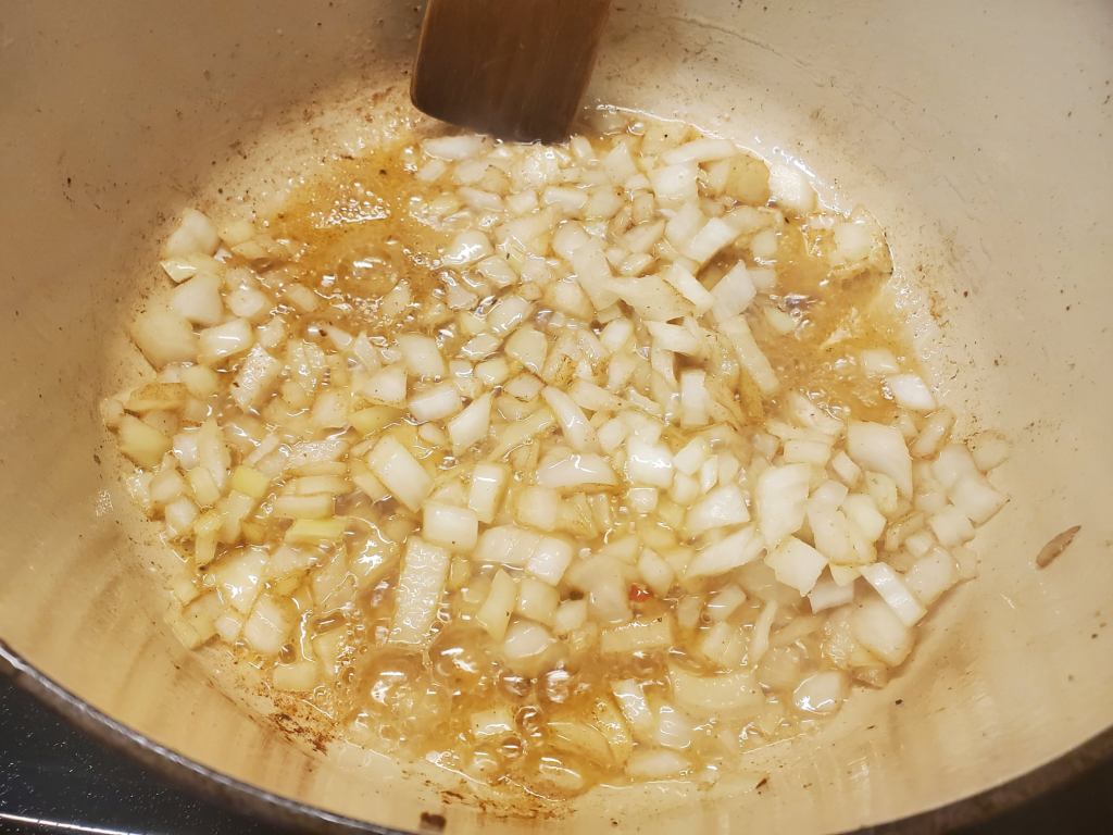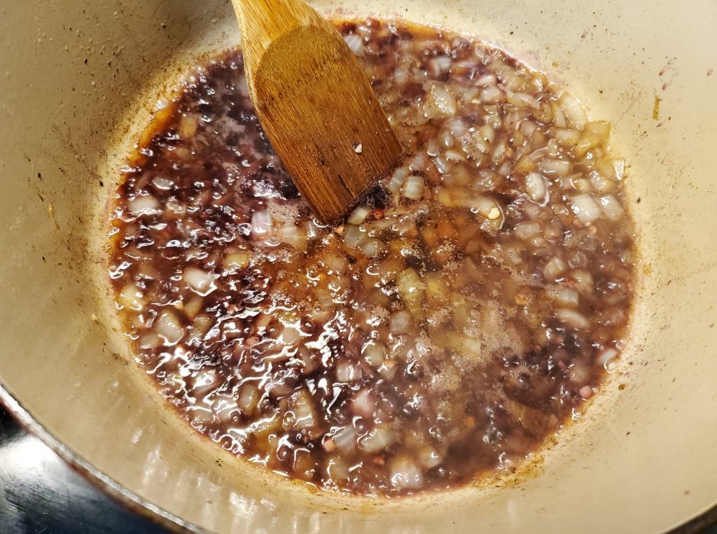 Begin by sauteing a chopped onion in extra virgin olive oil. After the onion begins to soften, add the garlic for just a minute before adding liquid ingredients so that it doesn’t overcook. I like to pour in the wine at this point and let it simmer for a bit.