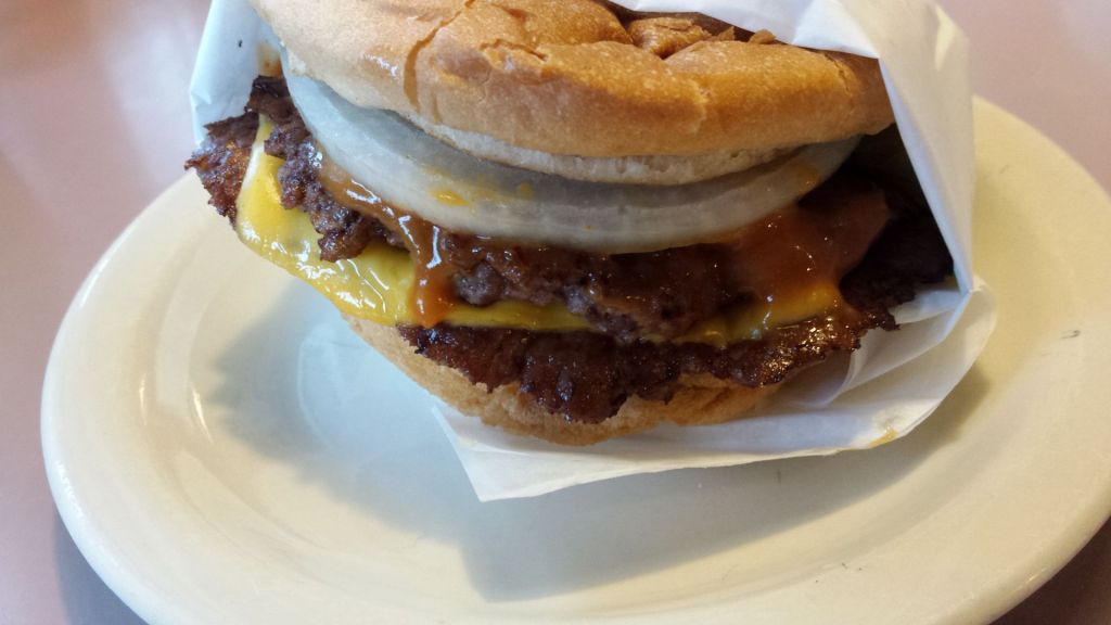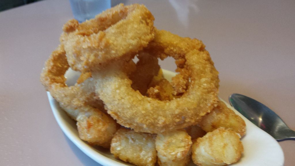We shared a mixed plate of onion rings and tater tots. My wife is a tots fan and I welcome the change from fries occasionally. My double cheeseburger looked just about perfect. The flat griddle-fried patties were smashed thin and had the lacy edges I love. But it was on the dry side and a little disappointing in spite of how good it looked at first sight.