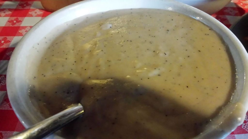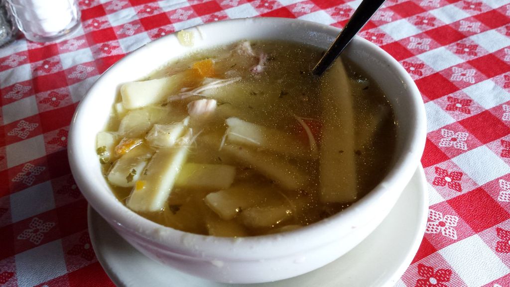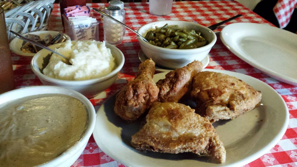 Stroud’s is known for serving complete fried-chicken dinners. It’s a meal for those with large appetites that begins with very good chicken-noodle soup and cinnamon rolls, then moves on to the main course, fried chicken. While those who can eat more than us in a single sitting may order a half-a-chicken, we settled for a drumstick and thigh each. On the side are tasty – and porky – green beans and mashed potatoes with a bowl of chicken gravy for ladling. We didn’t come close to finishing all of this food. Thankfully, there is no dessert included with the meal, nor is there any on the menu.