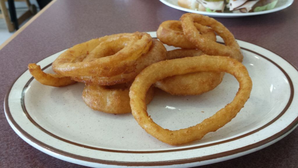 In spite of its remote location, the Cafe was fairly crowded at lunch hour. They had a Mexican buffet that many of the people there were taking advantage of. But we settled for sandwiches. Mine was a grilled cheese. There were burgers on the menu, but I had another one planned for later in the day and I had my limits. I stayed at least partially true to form by ordering onion rings on the side. Unfortunately, they were not up to the standard set by those I had eaten the previous couple days.