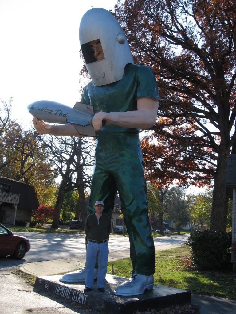 I had spent a lot of pre-trip prep time looking at photos of old restaurants, motels and kitschy attractions on Route 66 and was psyched to get my first close-up taste of these things; well, maybe not too close as far as the motels go. The first good opportunity we had was in Wilmington, Illinois. A drive-in restaurant called the Launching Pad was closed for the season, but it’s main non-culinary attraction was still on hand. I’m referring to one of the Mother Road’s famous roadside giants; the Gemini Giant spaceman, which stands tall and proud in the corner of the parking lot.