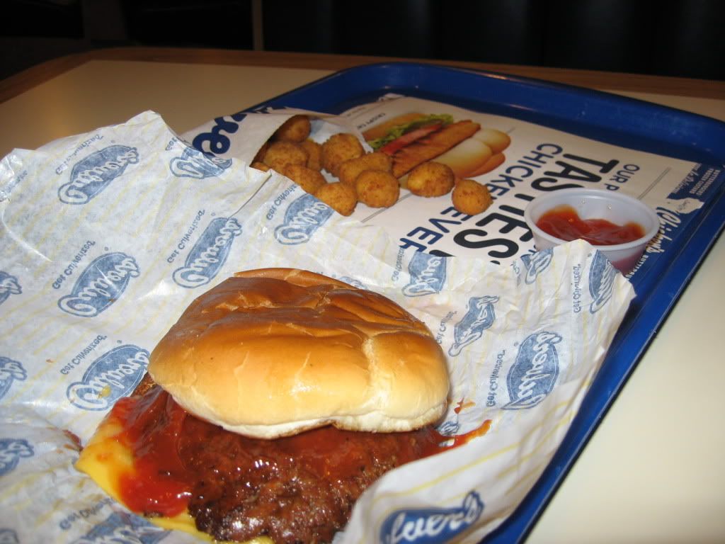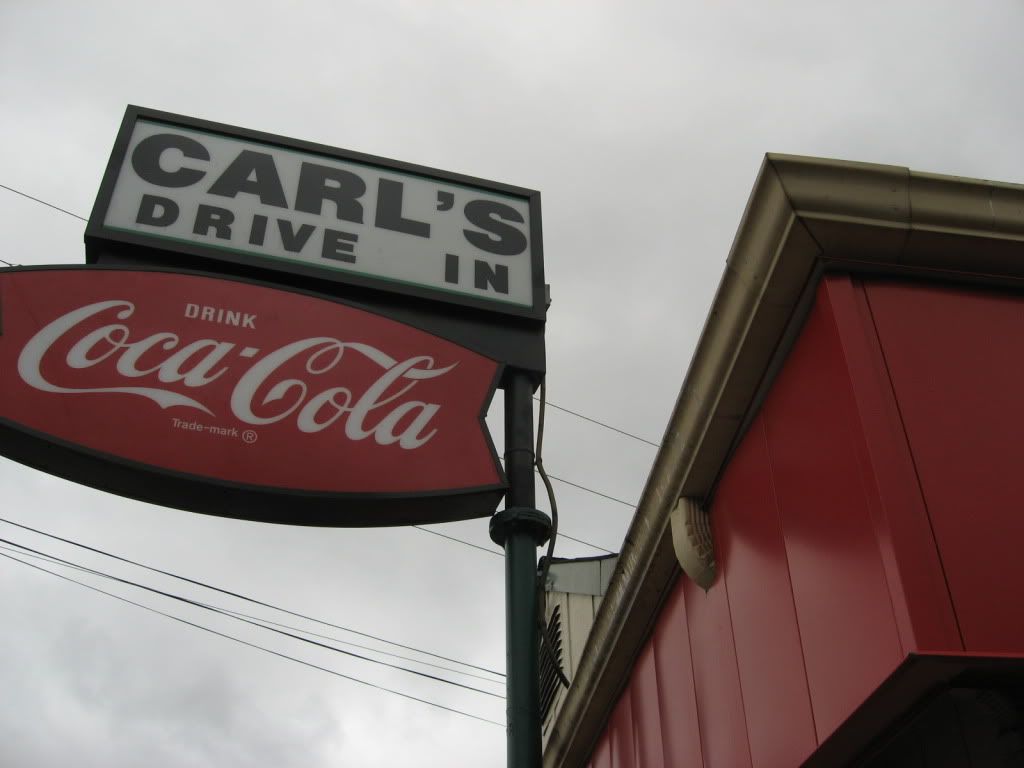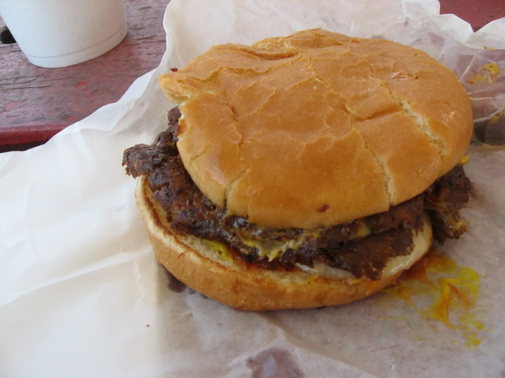 The Old Bridge is a scenic wonder and we enjoyed walking part of it and checking out the views from above the Mississippi. But I was eager to get to our next meal stop across the river, so we hopped on over to the New Bridge and made for Carl’s Drive-In in Brentwood, just outside of St. Louis. It’s appropriate that a classic little burger and root beer shack like this, with nothing more than a counter and stools inside, sits on Route 66. I mentioned in my top ten list the other day that the double-cheeseburger I had at Carl’s is in my pantheon of great roadfood that I’ve eaten over the years. It’s the perfect embodiment of the style of burger that I like most.