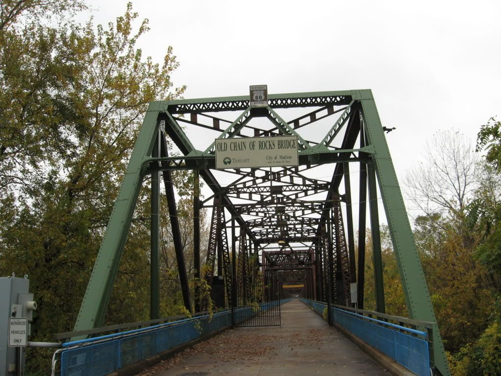 We pulled out of Springfield the next morning and rejoined the Mother Road as we headed for St. Louis. After passing through several small towns, we approached the Mighty Mississippi and the Old Chain of Rocks Bridge, which crosses it. The Old Bridge, which was built in 1929 and closed to motor vehicles in 1970, used to be designated as part of Route 66, but is now only open to foot and bicycle traffic between Madison, IL and St. Louis, MO. The New Chain of Rocks Bridge is fully operational and open to all vehicles between the two states.