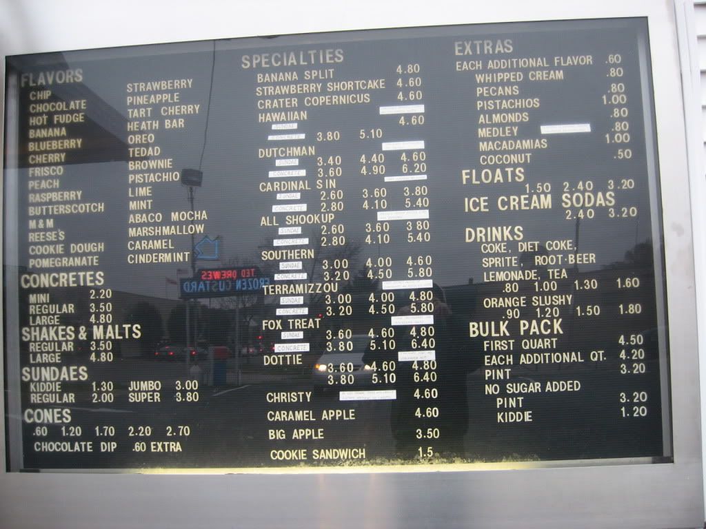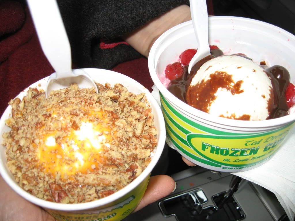 Under other circumstances, I’d have probably ordered a root beer float or a shake at Carl’s, but these weren’t normal circumstances. Carl’s is only a ten-minute ride from the Ted Drewes Chippewa location, which also sits on Route 66. Ted Drewes is one of the best-known frozen custard stands in the country and is known for their concretes, which they serve upside-down to demonstrate how dense their custard is. We skipped the concretes and went with sundaes; vanilla custard with cherry topping for my wife and vanilla with caramel and chopped nuts for me.
