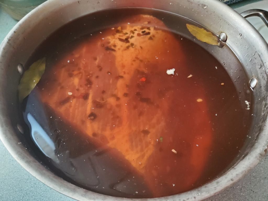 Preparing corned beef from scratch is a long process. I began by purchasing a five-pound brisket flat at a local butcher and brining and curing it in a water solution that included pink curing salt, regular salt, sugar, an onion, garlic, bay leaves, and pickling spices. The brisket was fully submerged in the solution inside the refrigerator for eight days, although I took it out to turn it over and resubmerge it once daily. At the end of that period, the rest was simple. I just boiled it for a few hours in water with more pickling spices.