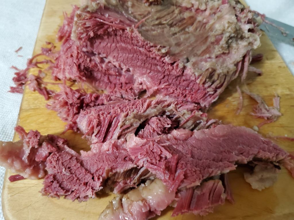 The final result was not what I was hoping for at first sight. The outside of the meat was still brown instead of the pinkish-red I was hoping for. Thankfully, when I cut into it, the color was perfect. It looked like any other corned beef I’ve had over the years. It also tasted great.