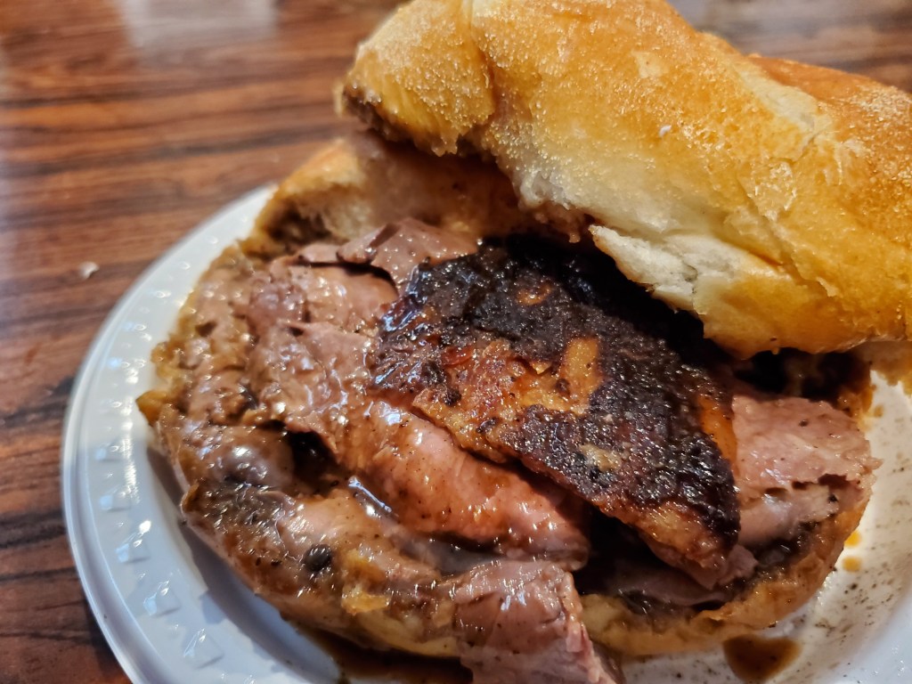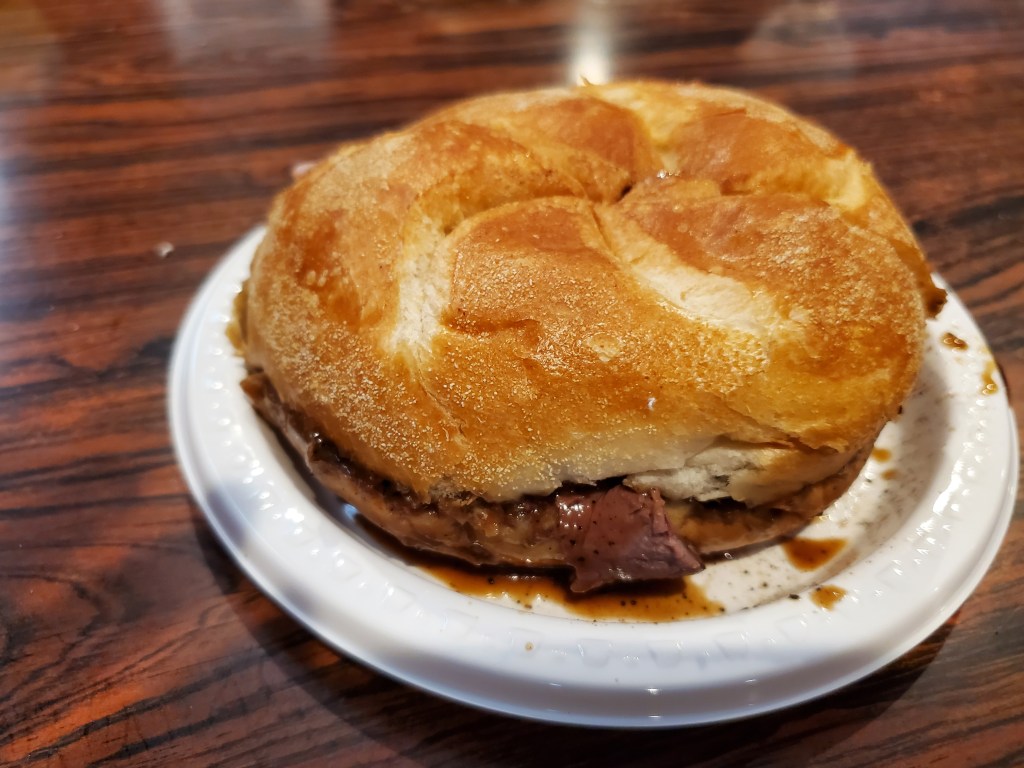 When I ordered my roast beef on a Kaiser roll, Andy recommended that I ask for “tips,” which means having the carver include slices from the outer layer of the meat, so that I would get the heavily-seasoned crust that develops while it goes through the roasting process. It’s somewhat analogous to brisket burnt ends in barbecue.