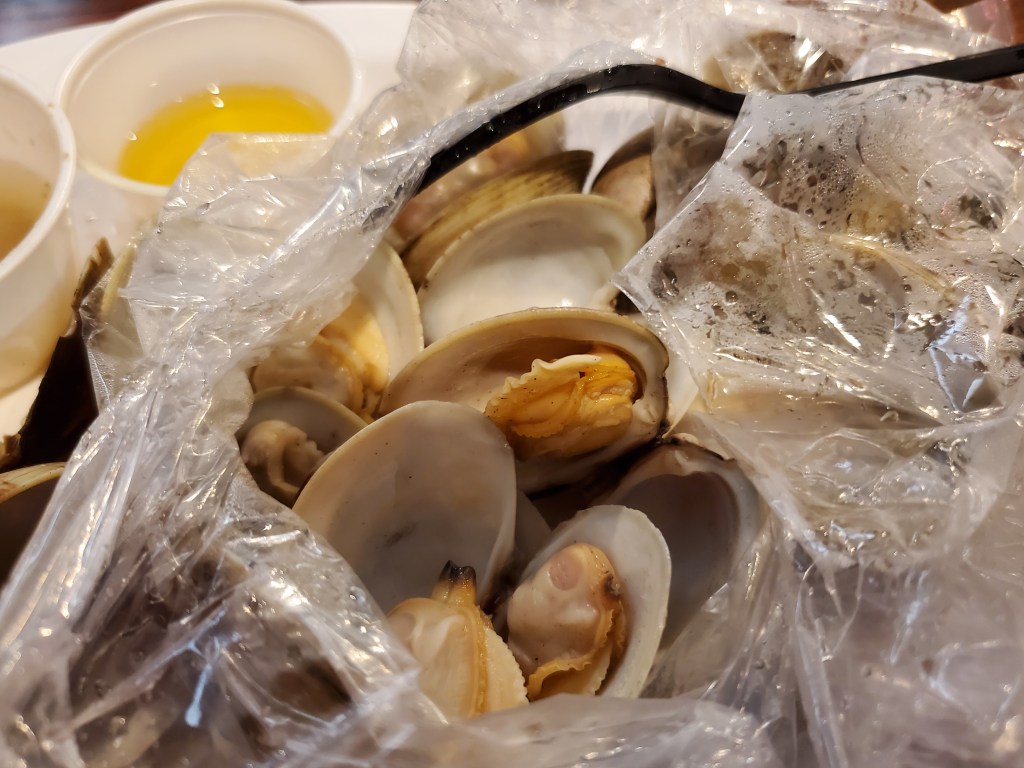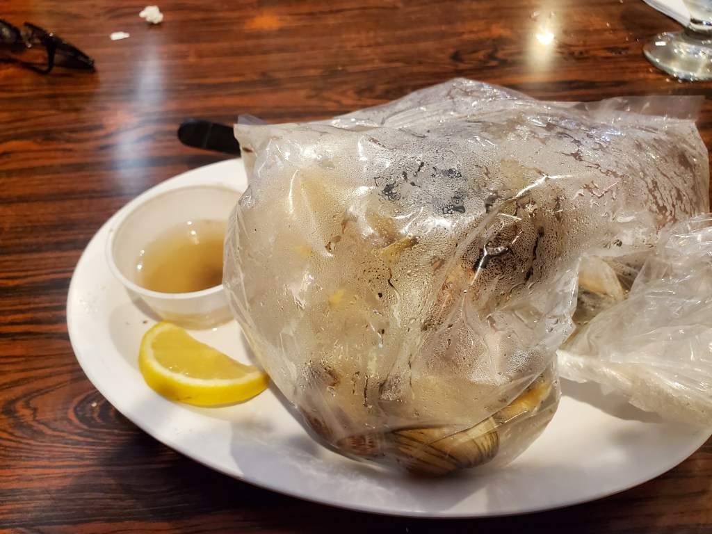 I have to confess to being somewhat shocked at how the steamed clams were served. They appear to steam the clams inside of a plastic bag and then just put the bag on a plate with sides of melted butter and natural clam juice. My first thought was that they were probably microwaved. I didn’t ask, and to my surprise once again, they were good enough for me to not care. The clams were not as small as little-necks often are and were perfectly tender, with a nice, fairly mild flavor, which the melted butter added to. I think I’d still have preferred that they remove the clams from the bag and serve them to me more traditionally.