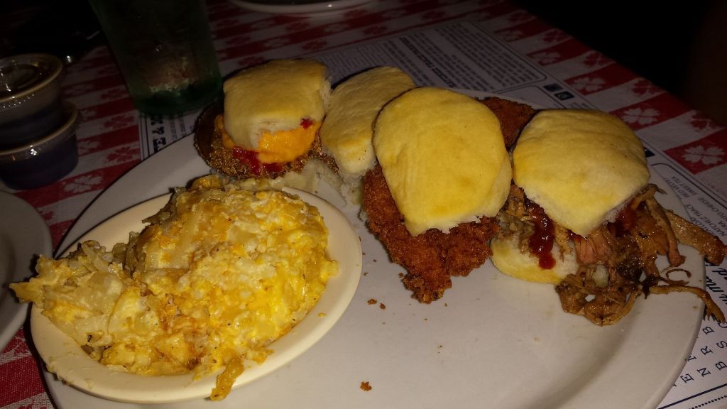That apparently wasn’t enough to satisfy my wife, because she ordered a biscuit sampler that included one each filled with pulled pork, fried chicken, and pimento cheese and fried green tomato.
