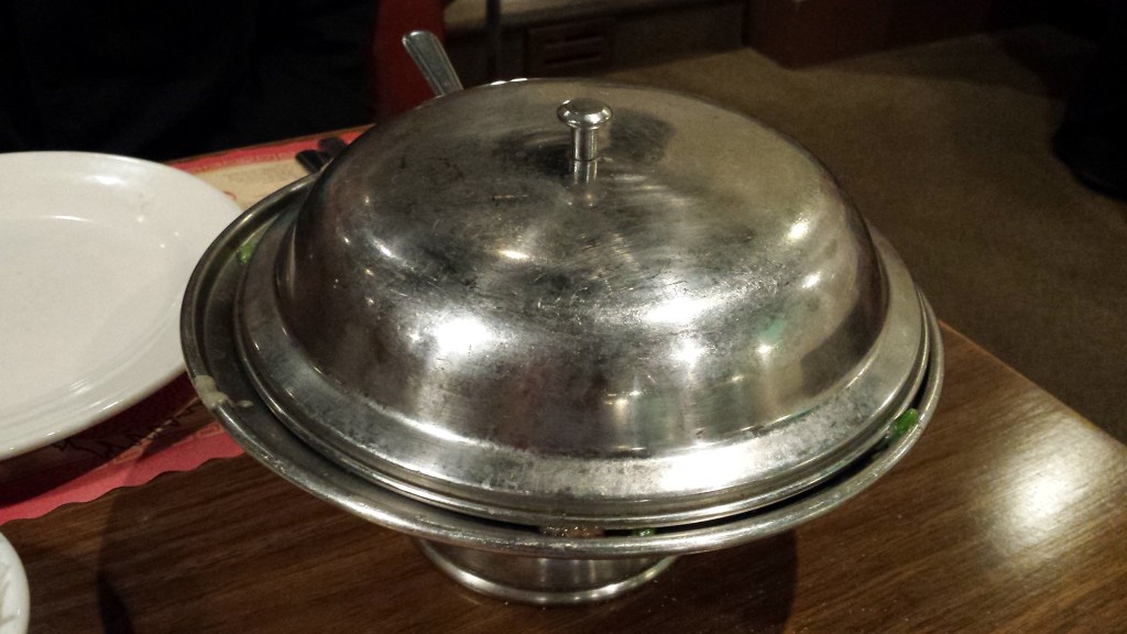 Another classic place my wife and I stopped at during that same vacation was Ding Ho, the oldest continuously-operating Chinese Restaurant in Columbus, Ohio. An entree we ordered there arrived in one of the above-mentioned metal serving dishes that were ubiquitous in the Chinatown restaurants my family ate at in the days of yore.