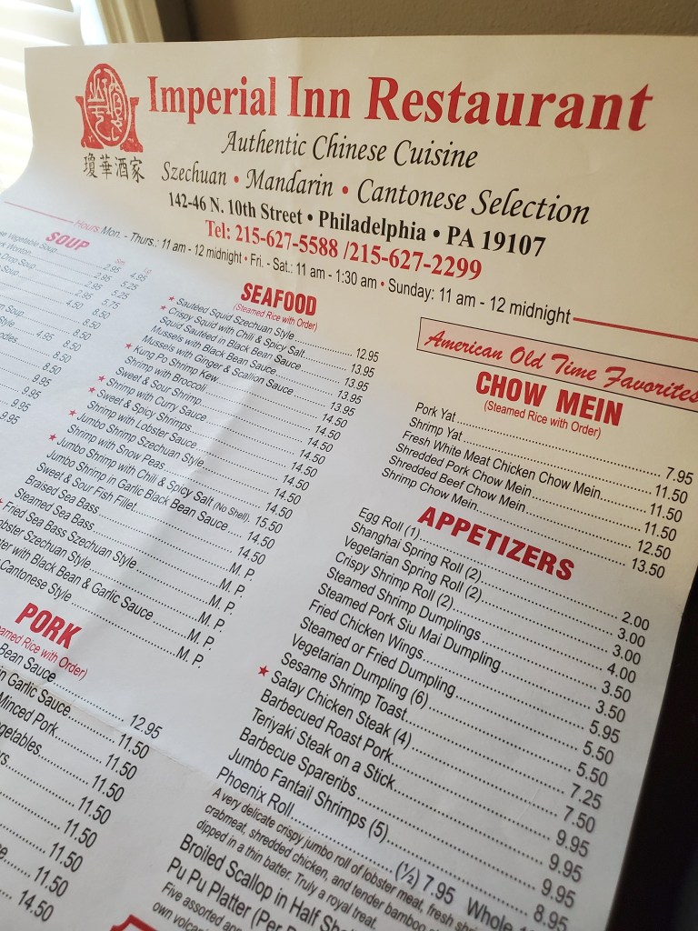 Although I grew up in a northern suburb of Philadelphia, my parents took me into the city often, and those trips frequently included meals in Chinatown. I still recall old stand-bys like the House of Chen, China Gate, South China, and the Magic Fan, which we ate at regularly. The Lotus and Imperial Inns were the two Chinatown restaurants that were a bit fancier in those days. We would go to one of them for special occasion dinners.