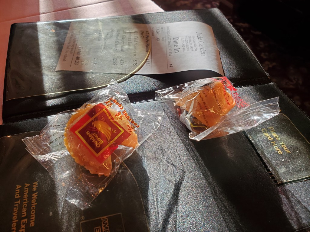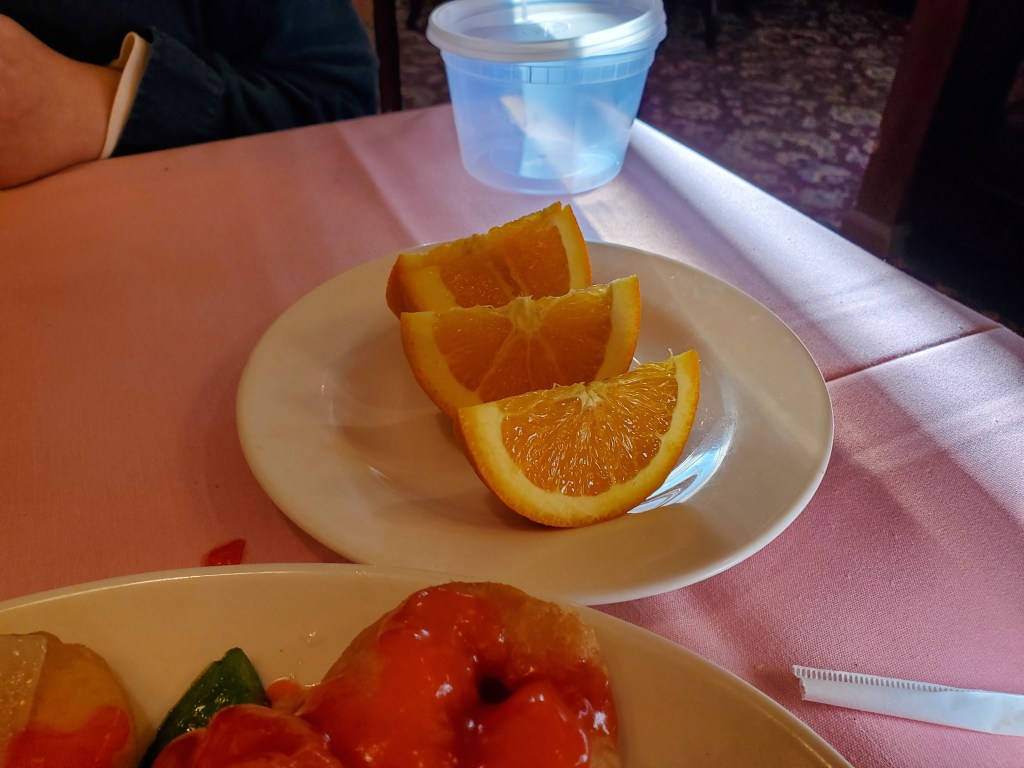 Our check came with the traditional complimentary desserts; orange sections and fortune cookies.