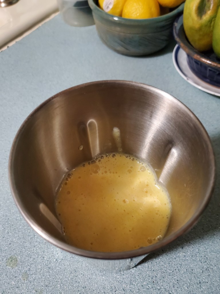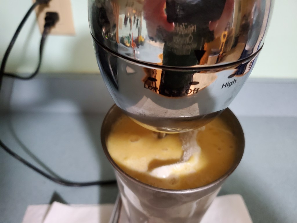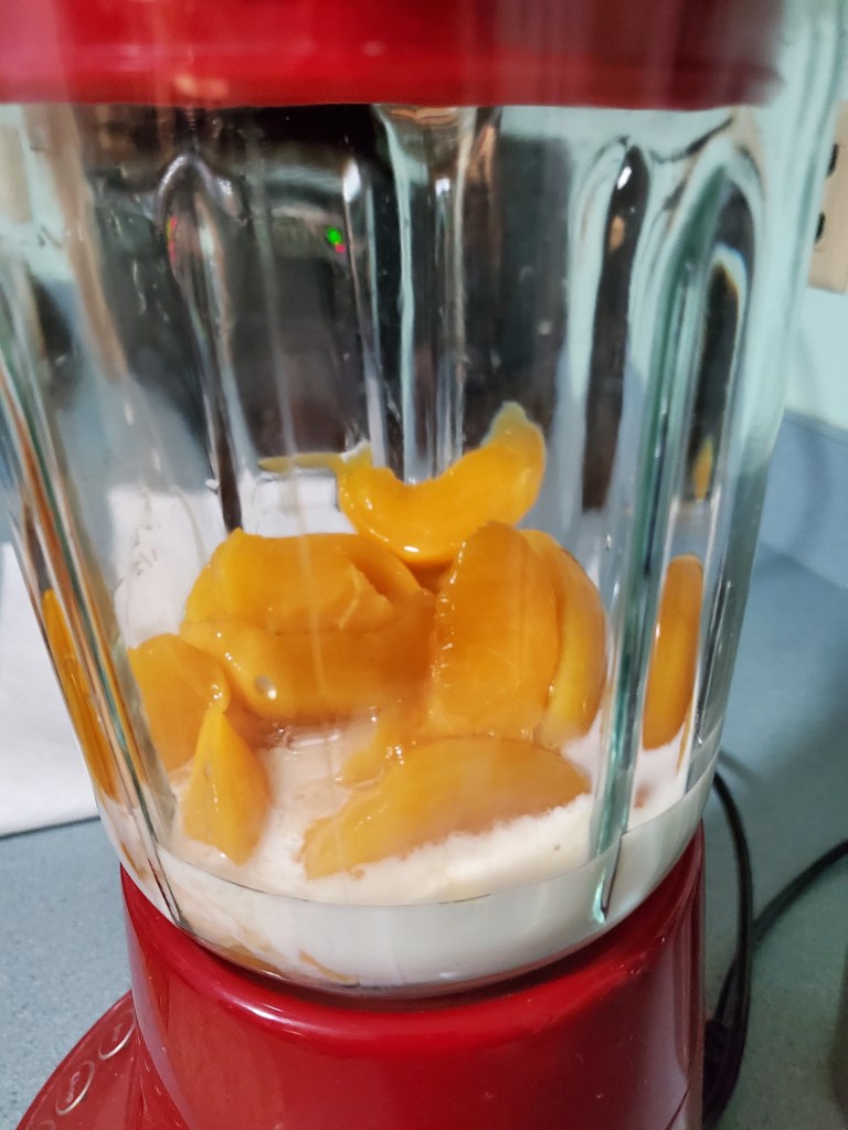 After draining the peaches so the fruit juice they came in wouldn’t impact the taste of the shake, I mixed them with a little milk in a regular blender.