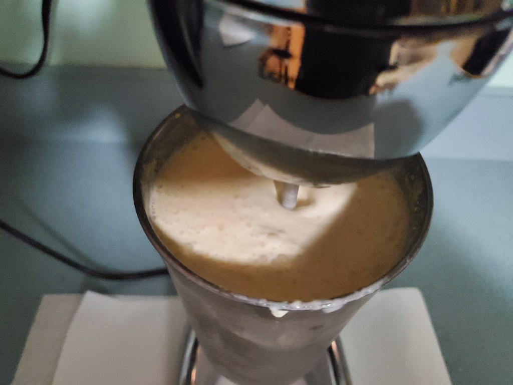 I always prefer to make shakes in my milkshake maker rather than a regular blender. so I transferred the blended peaches and milk into a classic metal cup, added the entire pint of vanilla ice cream, and blended away.