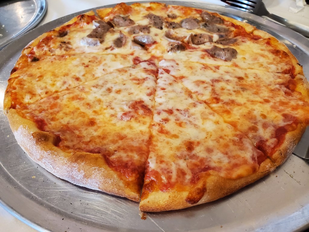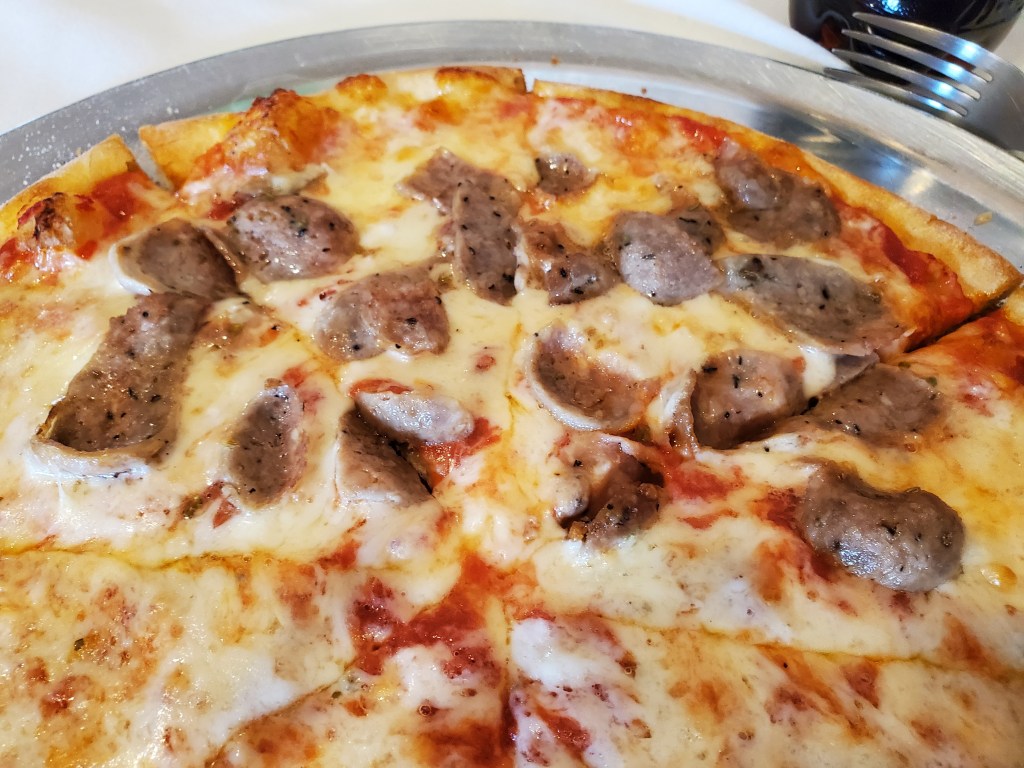 I didn’t have any notion of how good their steaks are and decided to change things up a bit by getting a cheesesteak stromboli instead. John and I split both that and a small pizza with sausage on one half.