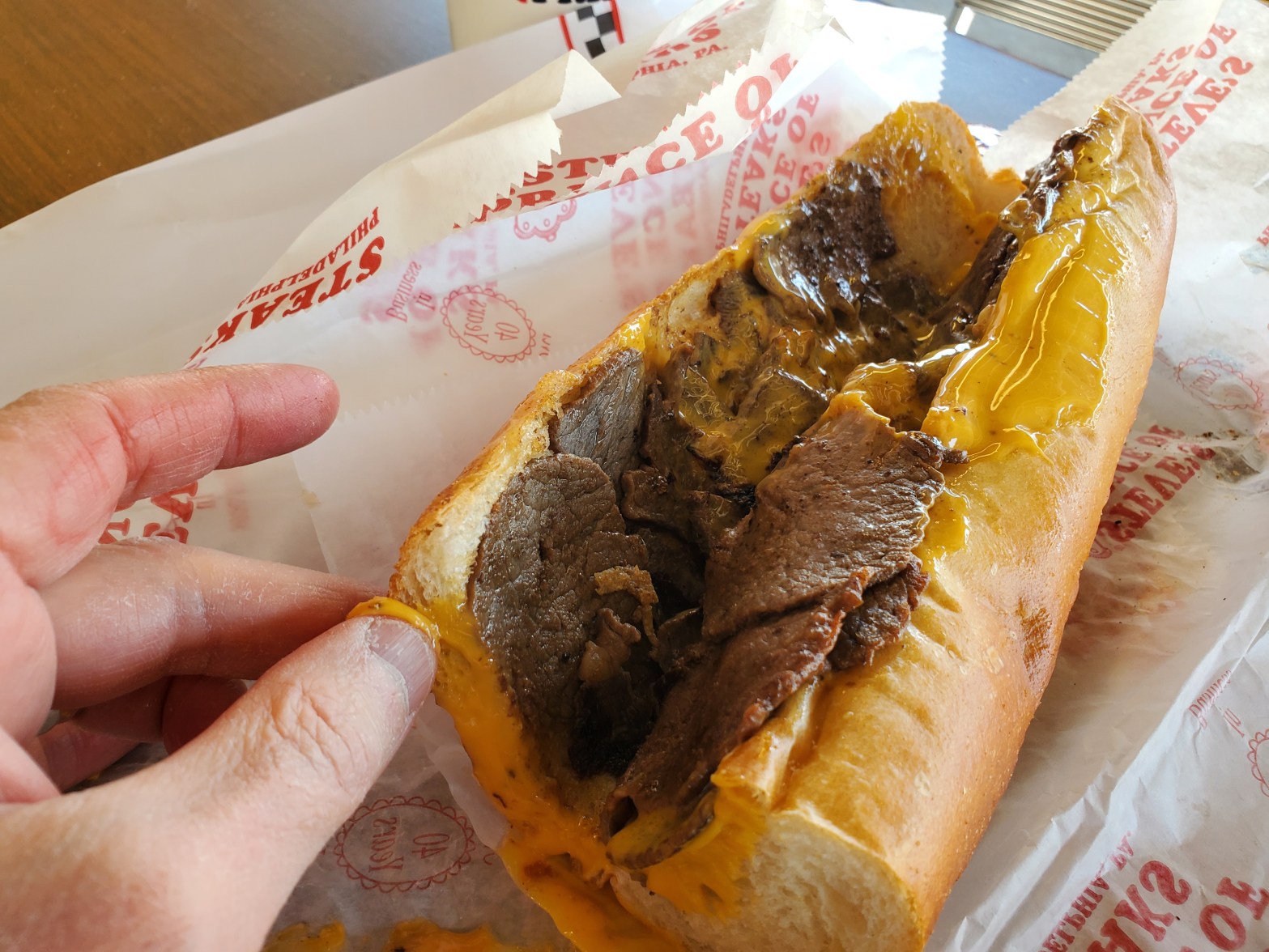 The combination of those pieces of extremely tender ribeye, all of that great-tasting Whiz, the fried onions, and the roll is just fantastic. I wouldn’t argue with anyone who says that this is what a cheesesteak should taste like.