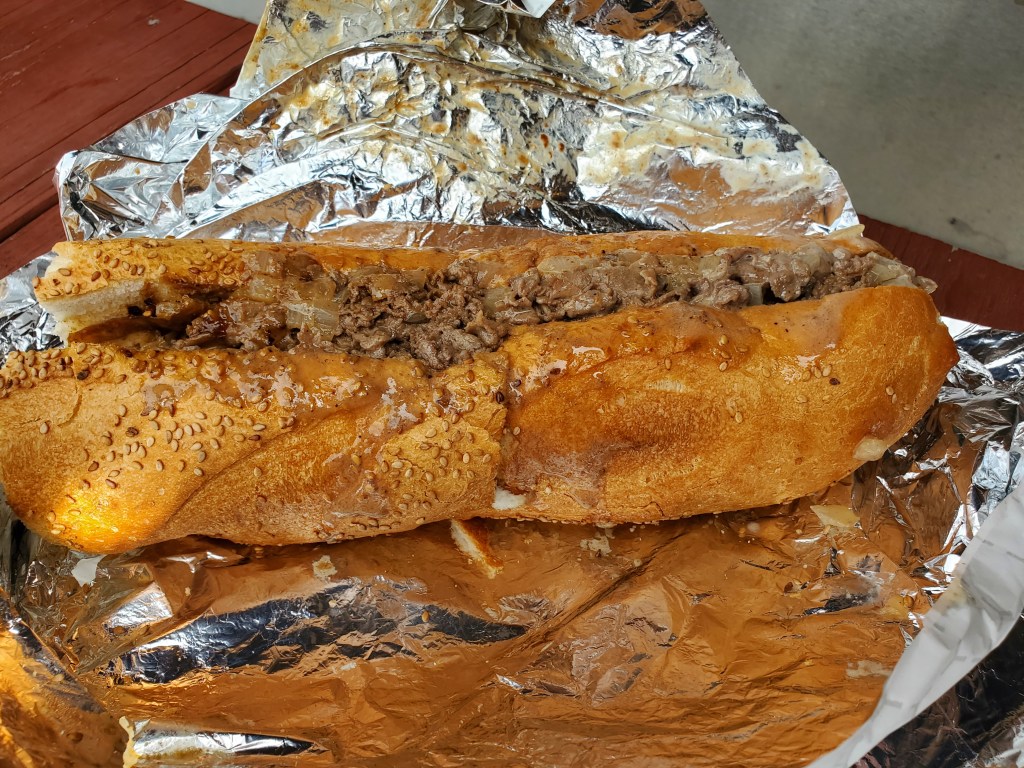 JRP’s fame is grounded in two sandwiches: cheesesteaks and their namesake roast pork sandwich, which normally comes dressed with sharp Provolone cheese and spinach. I tried a half of each close to a decade ago, when my wife dropped them off at my office. But as my regular readers know, it’s better to eat a long-roll sandwich as soon as you get it, rather than leaving it wrapped for a while – especially when it’s wrapped in foil, as is the case at JRP. The foil steams the sandwich and makes the roll soggy. So I needed to go to the stand and eat a steak on location if I was going to be able to determine its rating. The memory of that sandwich from years ago wasn’t going to get the job done.