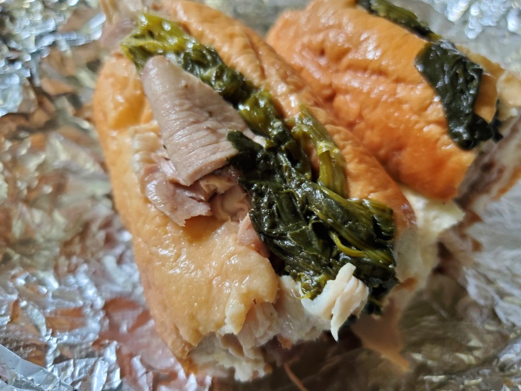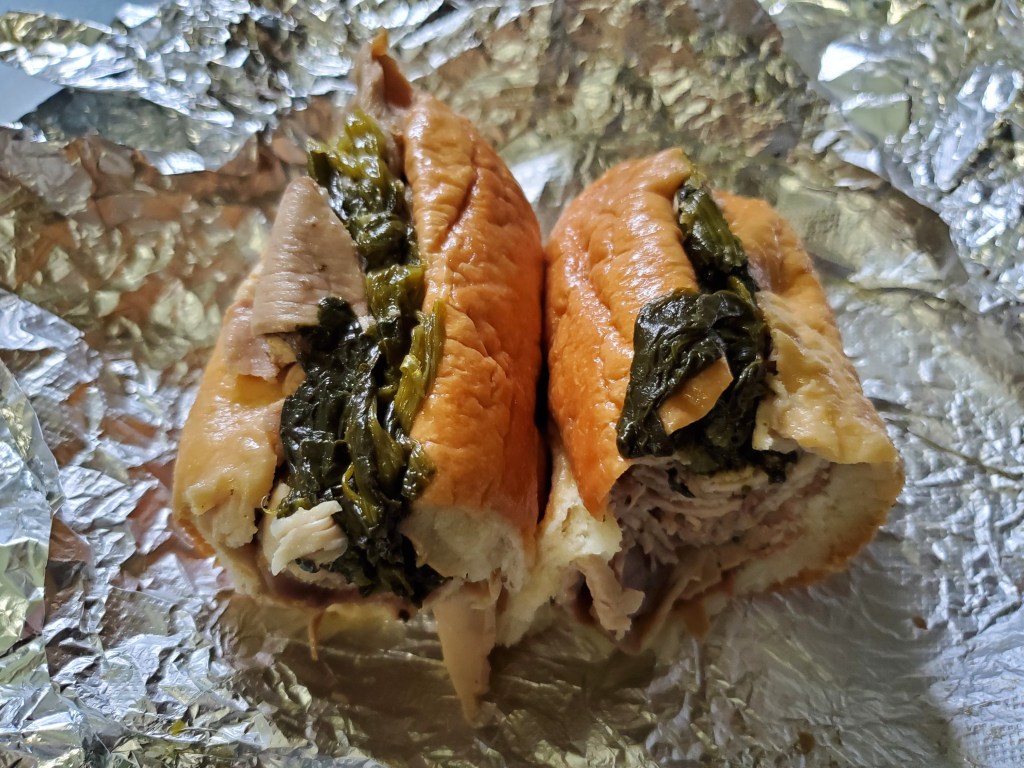 As John mentioned, the roast pork I’m familiar with (by reputation only) has broccoli rabe as the ingredients. On a sandwich fresh from the counter are the greens supposed to be fairly wilted or still retain a little bit of structure?