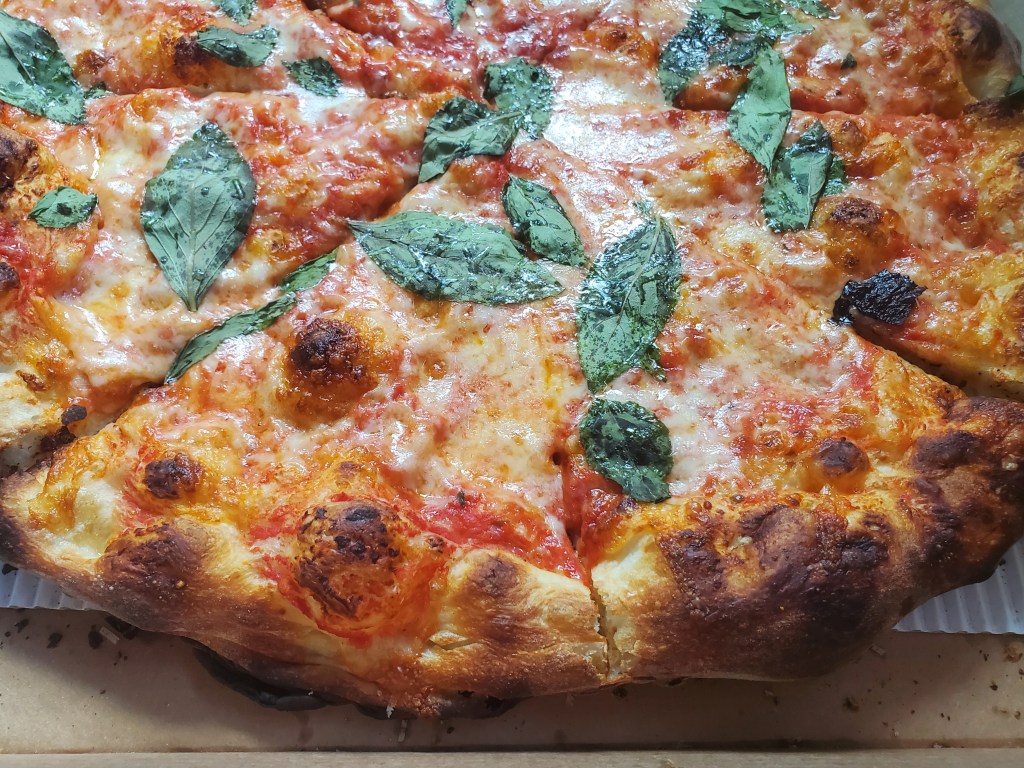 And its flavor is exceptional. The sauce has just the slightest hint of sweetness, while the fresh basil imparted a nice, additional layer of flavor – even after I removed the leaves. Not surprisingly, they use high quality Mozzarella and just the right amount of it. I would guess they also grate a bit of another Italian cheese on top.