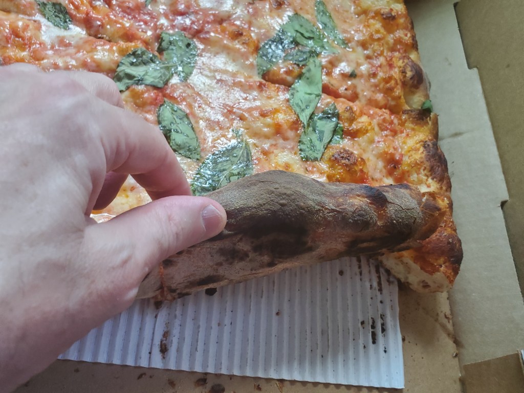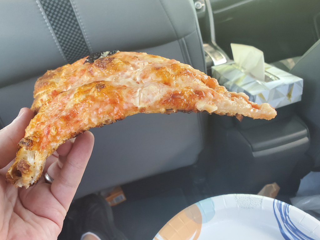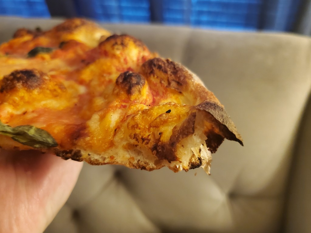 I only had one slice after eating most of the steak, but ate several more later for dinner. If anything, sitting around all day – without being refrigerated – seemed to give the pizza’s flavor more time to fully develop.