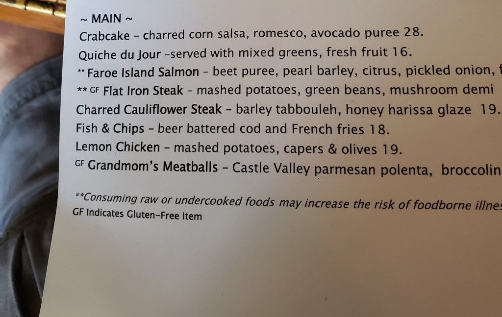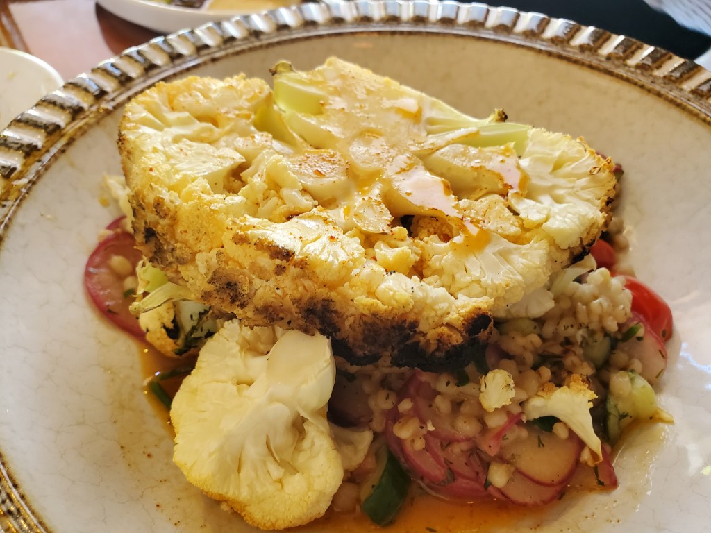 I didn’t hear what my wife had ordered and had no idea what it was when the plate was dropped off. It turns out the item in the below photo is a charred cauliflower steak. The entire concept is foreign to me. But as long as she was happy with it – and she was.