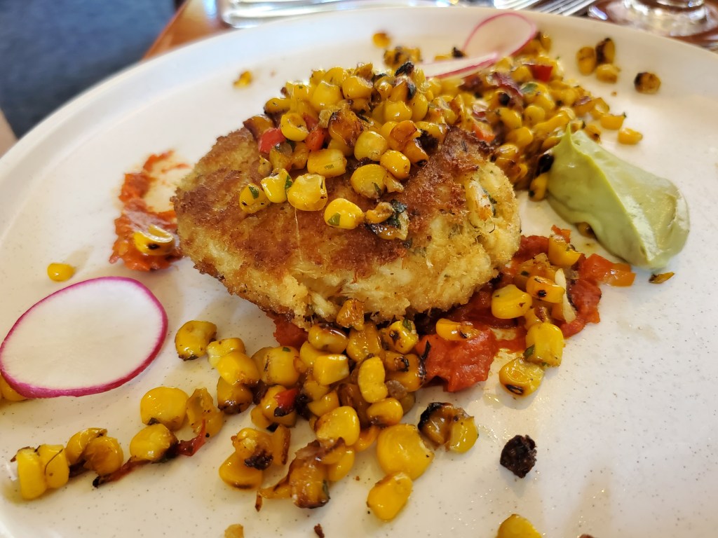 Our main courses were up next, and Tom went with the crab cake that I had considered. He was clearly smitten with it, as well as the charred corn salsa that it came with. I thought it looked impressive, but still wasn’t sure it would have been enough to eat given my bigger-than-usual appetite Saturday afternoon. (That Curly’s cheesesteak could have expanded my stomach)