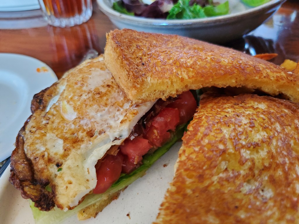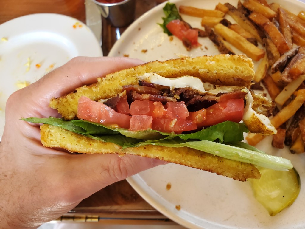 The egg is on top of the bacon in the photos and was fried over medium. I’m used to a little more bacon on my BLTs, but the presence of the egg at least partially compensated for that. The brioche bread was toasted perfectly.