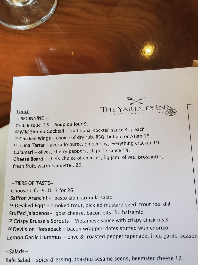 My wife and I had a lovely Saturday afternoon that was centered around lunch with our friends Tom and Bernadette. They live in North Jersey, at least a couple hours from us, so we decided to pick a place that was relatively close to the half-way point between our two homes and settled on The Yardley Inn.