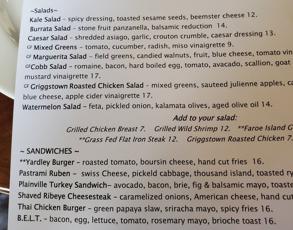 All of our visits to old inns or taverns in recent months have been for lunch. And at each one, albeit to a lesser extent at the Yardley Inn, they’ve had fewer menu options than would have been the case for dinner. That’s not surprising. Most people aren’t in the habit of ordering steak or prime rib for lunch. They also probably get a much bigger crowd for dinner. But it did leave me with a somewhat difficult decision when it came to ordering.