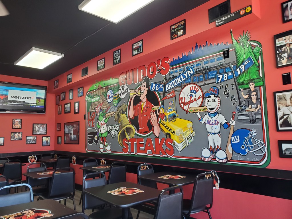 They are in a small strip of shops on US-13 and have a fairly nice seating area by steak shop standards. The owners must be from New York City; probably Brooklyn specifically. They’ve created an atmosphere that is a blend of Philly and NYC, with walls that pay tribute to both cities’ sports teams and also have a mafia motif.