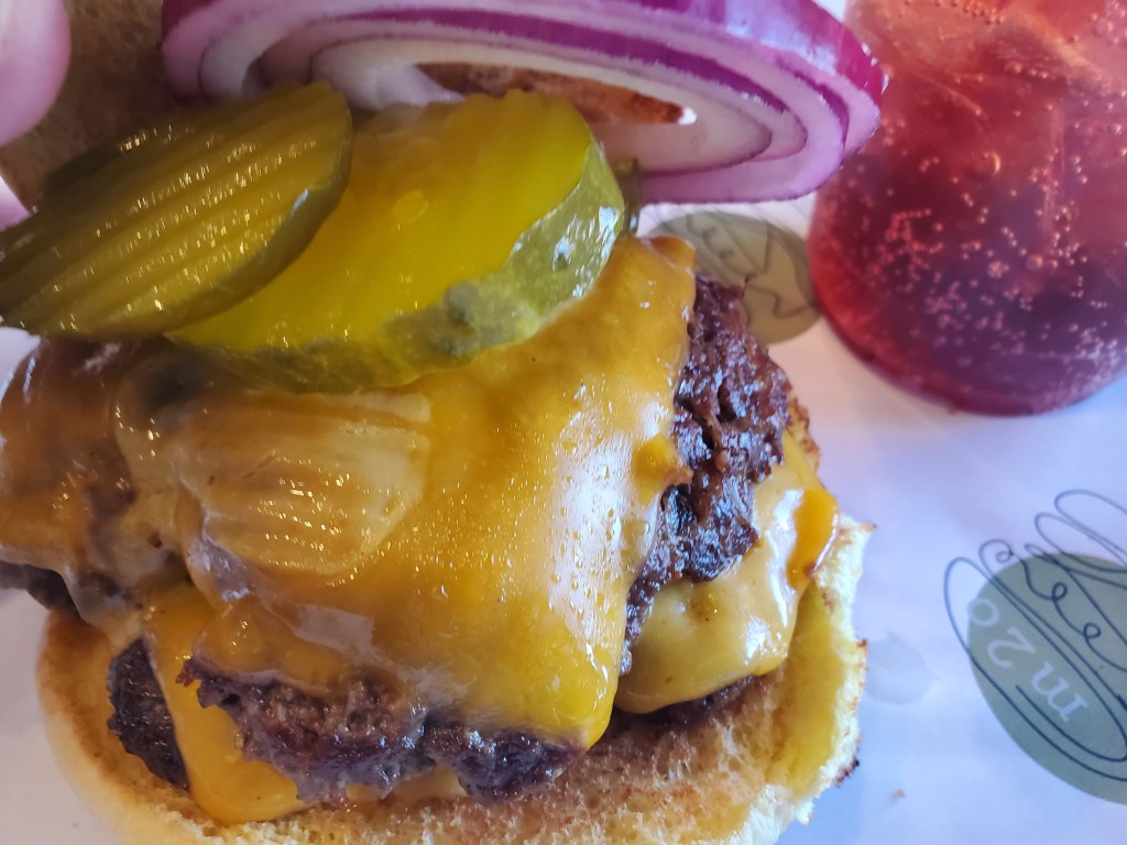 The burger was cooked to order and ready in about 10 minutes. The two patties combined with the onion and pickles made for a tall and attractive stack on a fresh potato bun.