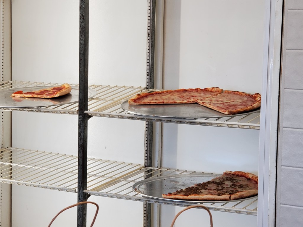 1. The pizzas look good but leaving slices and partial pies out at room temperature isn’t done around here AFAIK; places that sell by the slice keep them in a warmer.