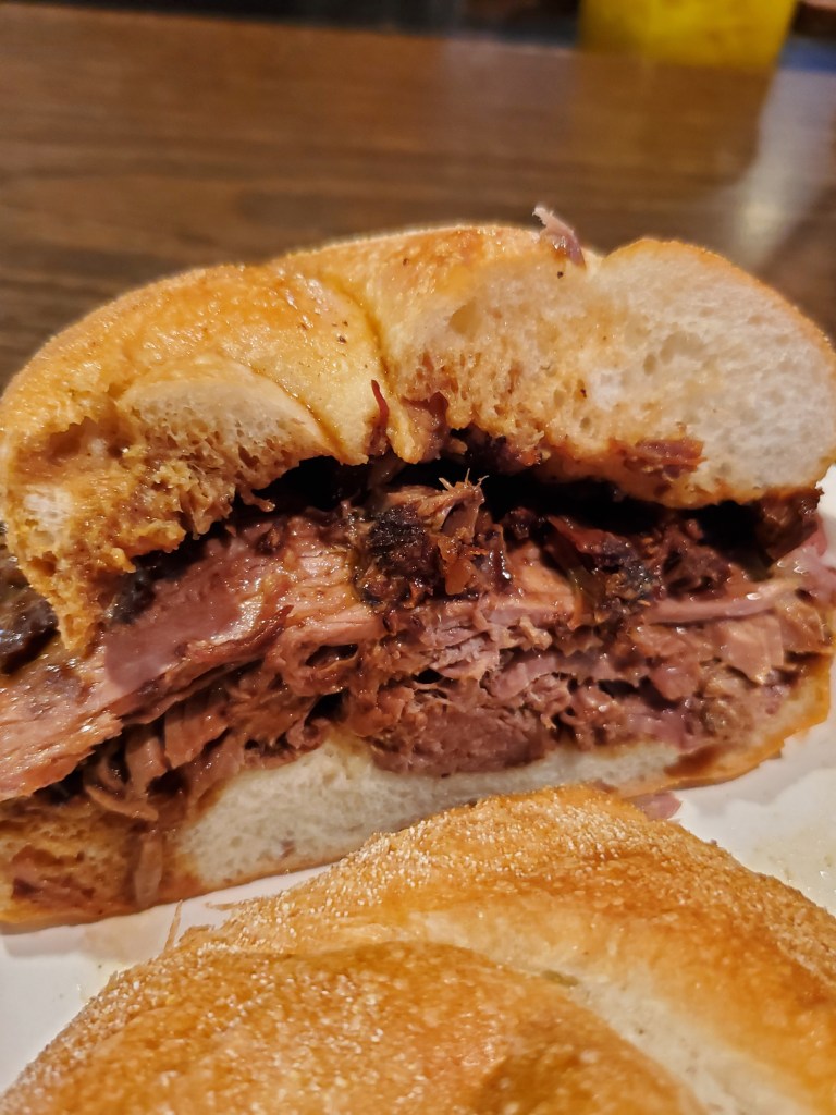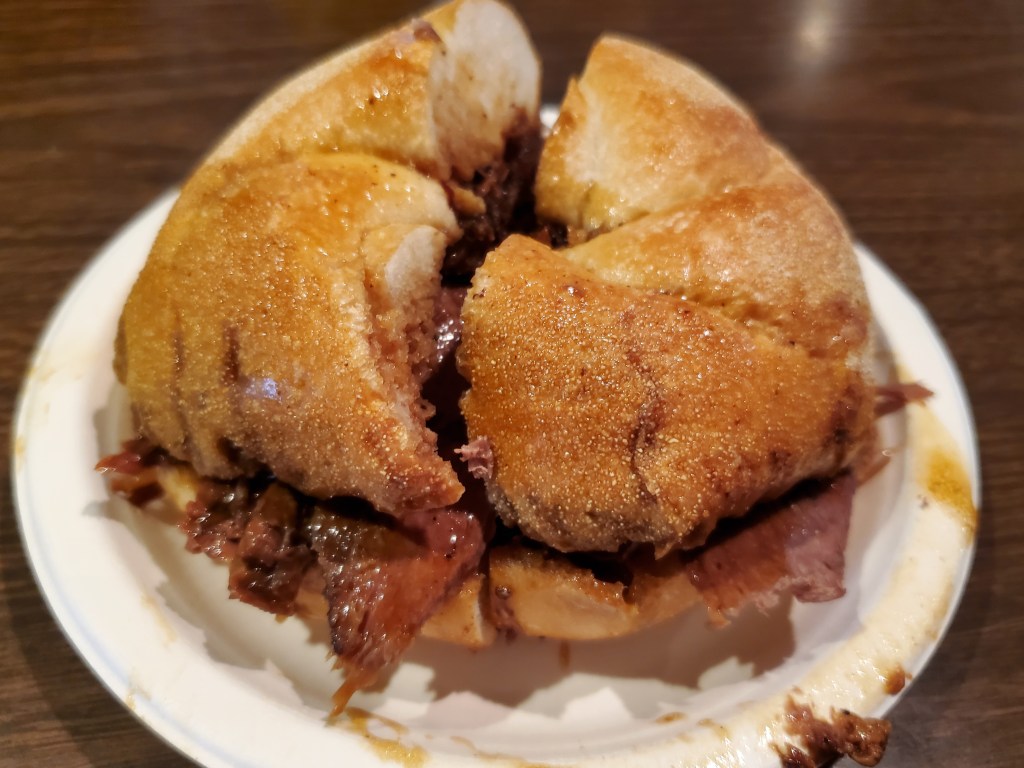 It only took a few minutes for my sandwich to arrive. It came on a paper plate that was barely bigger than the roll and it had gravy on it. I suspected I had a messy eating experience ahead of me, but it didn’t turn out that way. The sandwich stayed together nicely.