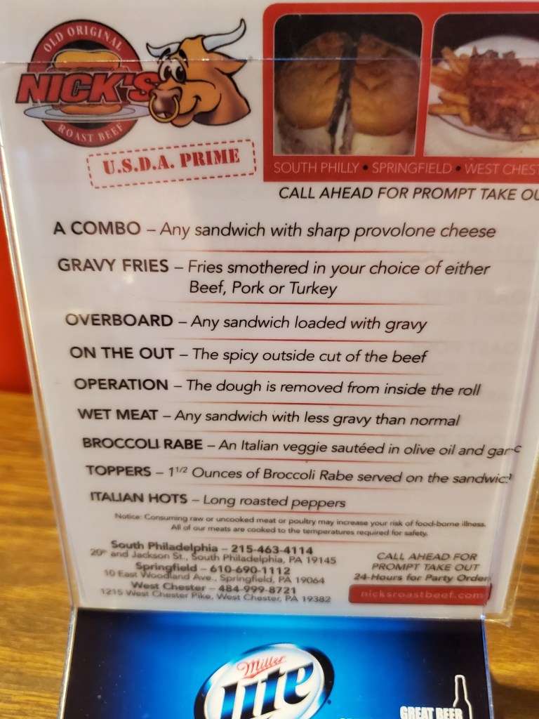 I had an early lunch at the Old Original Nick’s Roast Beef in Springfield, PA, this morning. In fact, I arrived just after they opened at 10:30 a.m. and was their first customer, although a couple of their staff were enjoying sandwiches before the lunch rush.