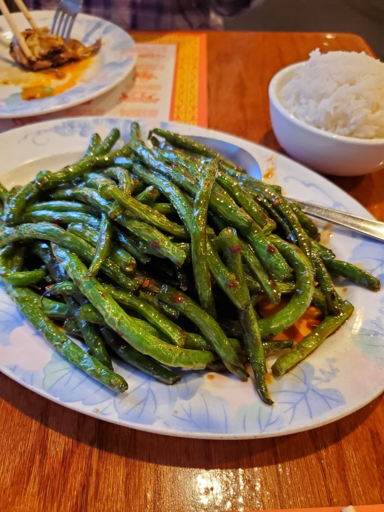 We had settled on both roast pork and duck appetizers, but when I was informed they were out of duck, I switched to soyed chicken; a dish I’ve seen on menus in Philadelphia but had never ordered. I added an egg roll while my wife ordered noodle soup. We also both felt the need to add a little greenery to the scene. That came in the form of sautéed green beans.