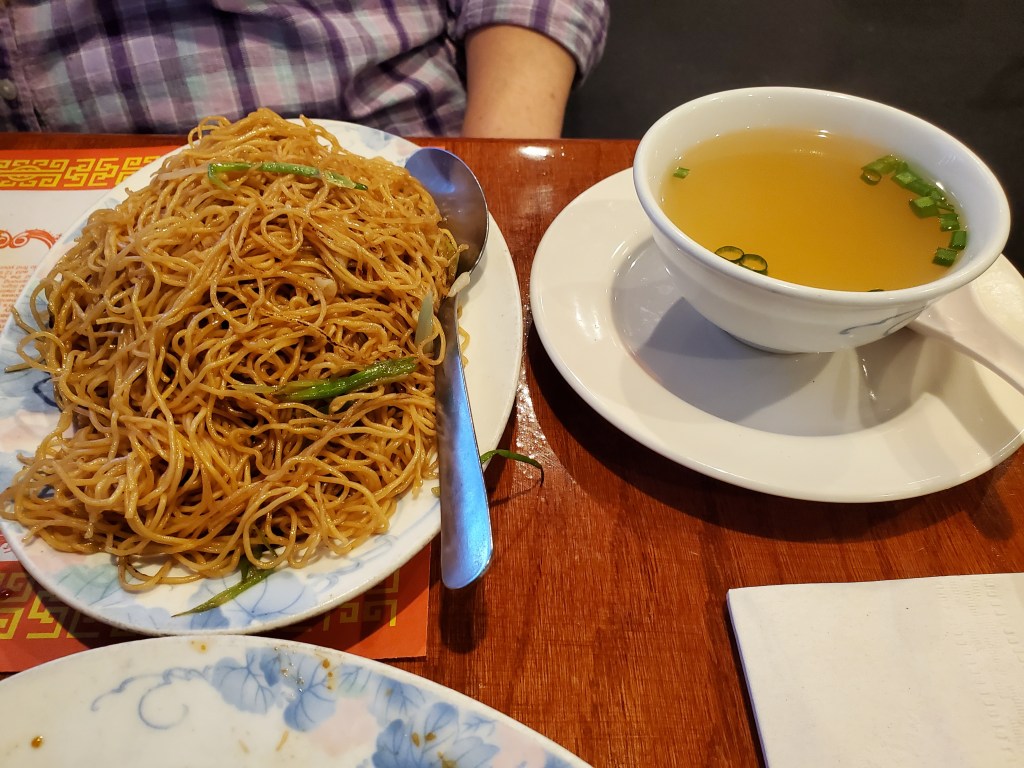 We were amused when my wife’s noodle soup arrived as a bowl of broth and a large plate full of thin noodles. She wound up using some of the noodles as the base for a takeout platter she put together when we were too full to eat any more.
