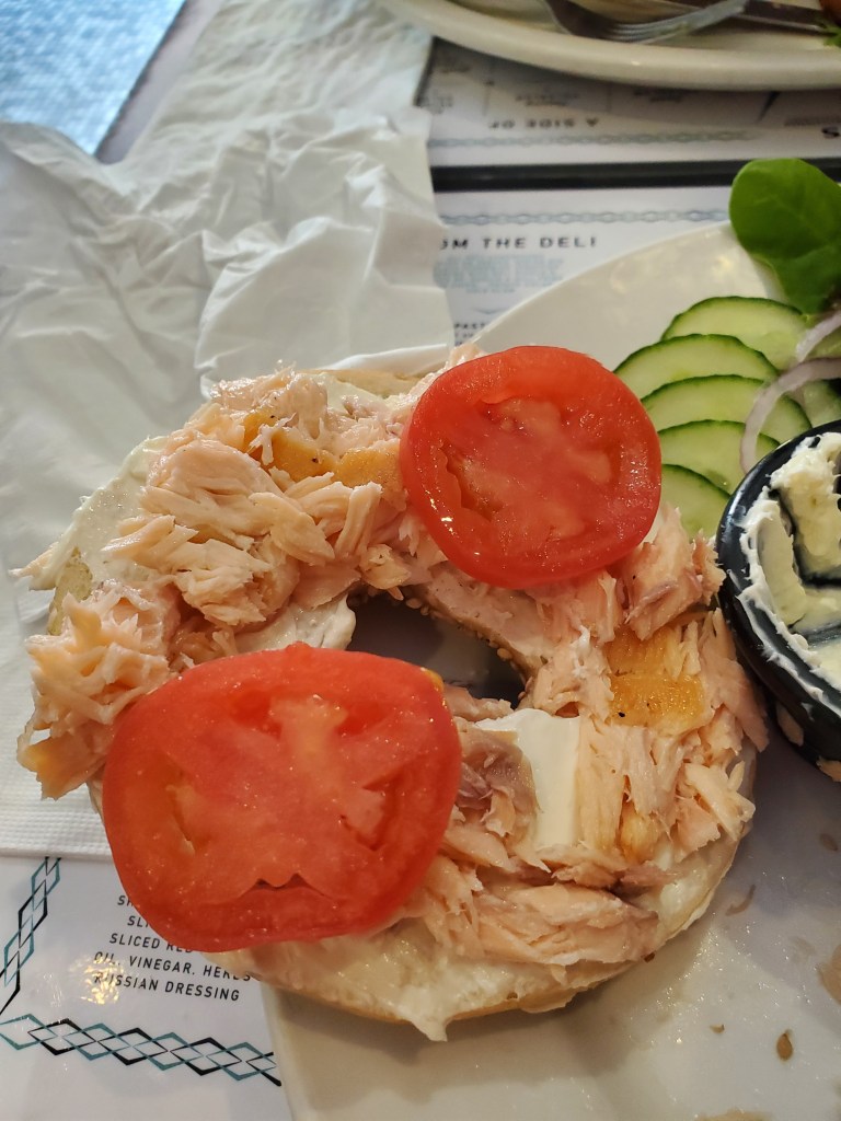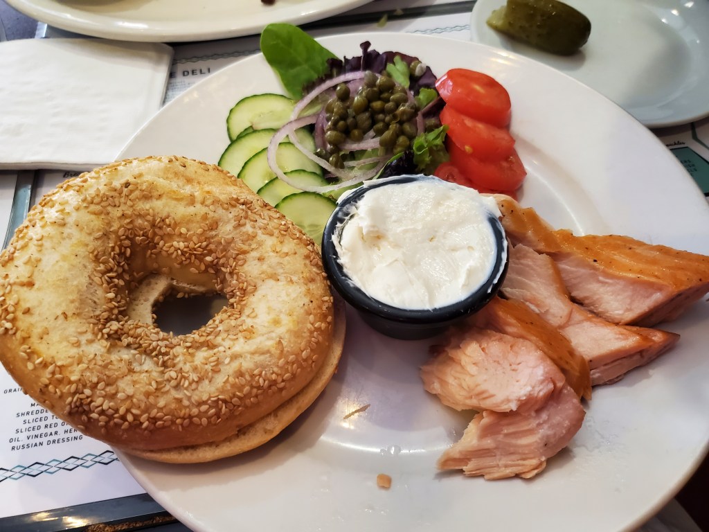 I would have loved to have included photos of a corned beef or pastrami sandwich here. But I was eating so much red meat on this trip – including a large helping of beef short rib at the hotel in Staunton Friday night – that I felt the need for a change of pace. So I opted for what I almost always order at a Jewish deli when I’m not having corned beef or pastrami – a bagel with kippered salmon and cream cheese.
