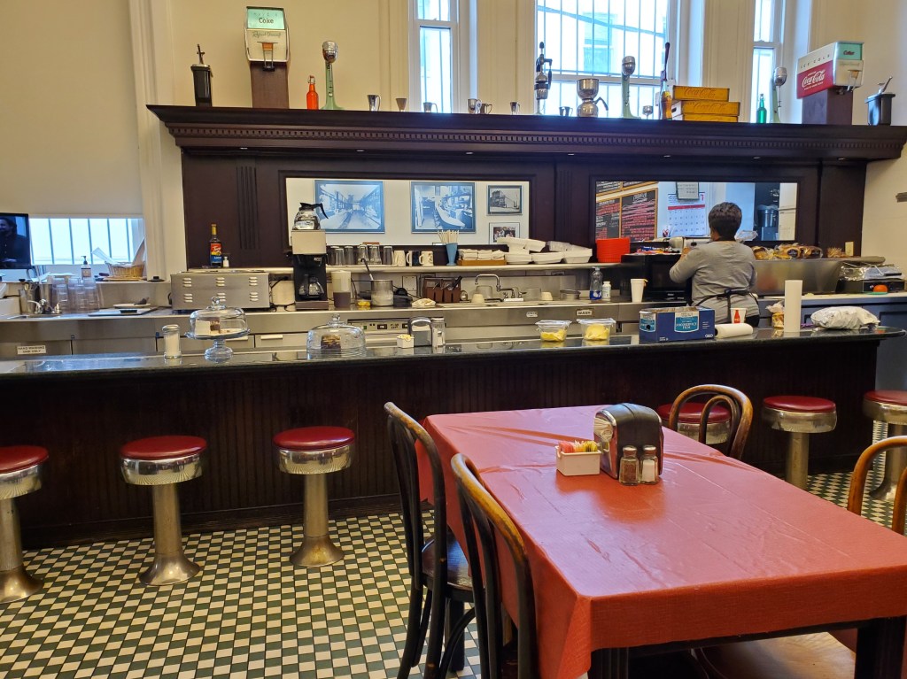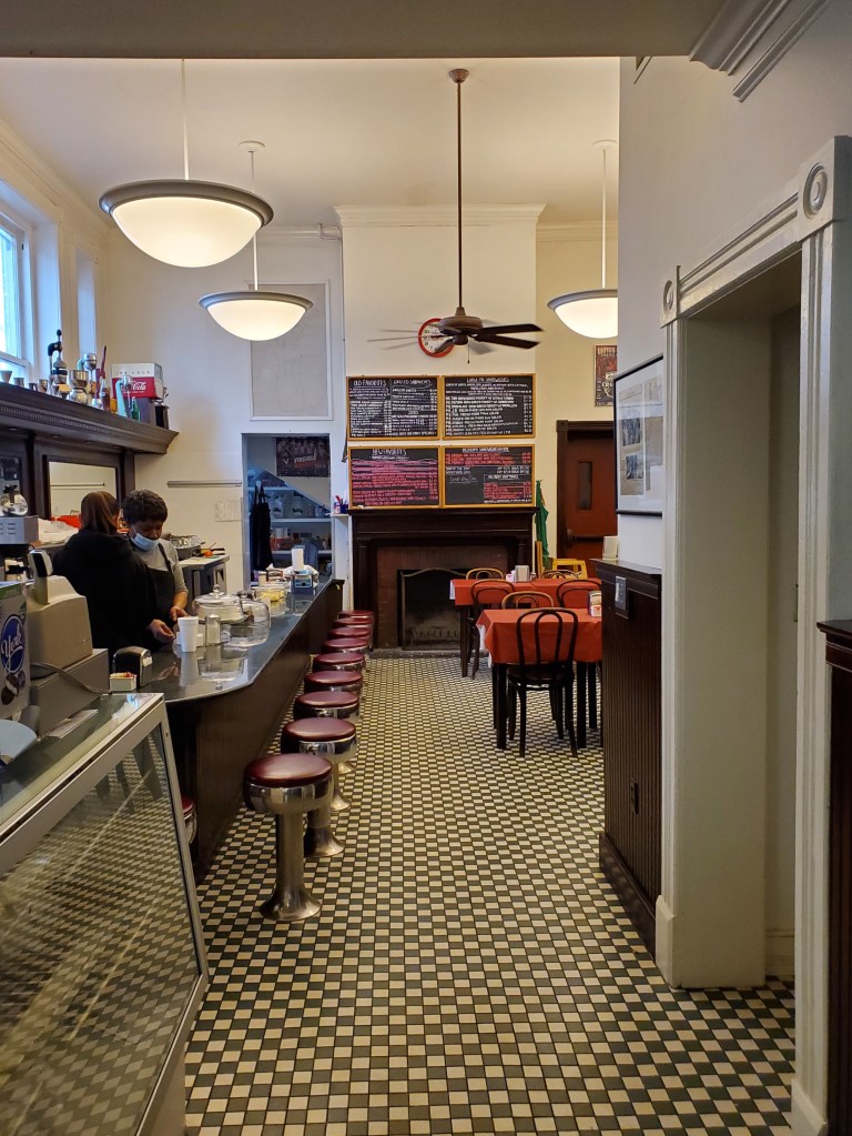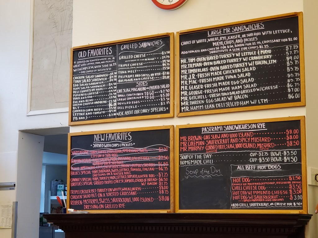 The dining area looks a little worn, but I imagine it hasn’t changed much over the course of many years. They have classic old milkshake makers on display behind the counter and a chalkboard menu full of sandwiches that are named after various people – I would guess old customers and/or employees – on the back wall.