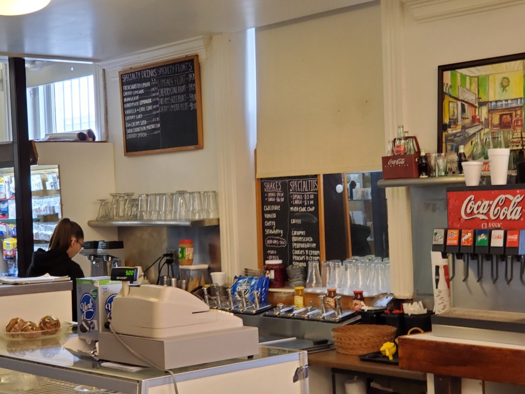 Notice the old milkshake makers and Coke dispensers on top of the case behind the counter.