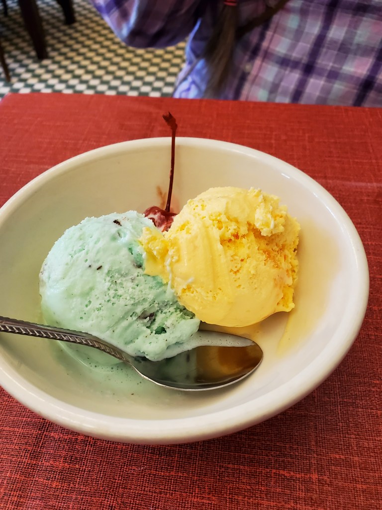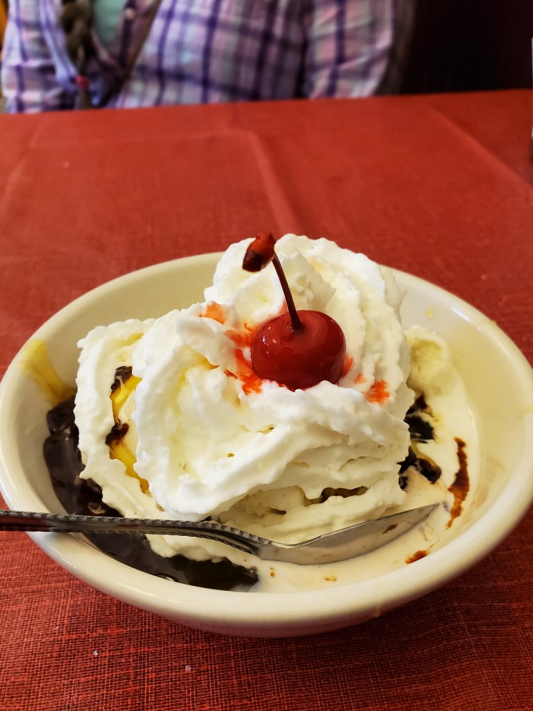 I was a little disappointed when our ice cream arrived in regular bowls instead of traditional soda fountain dishes, but my hot fudge sundae hit the spot, while my wife enjoyed scoops of mint-chocolate chip and peach ice creams.