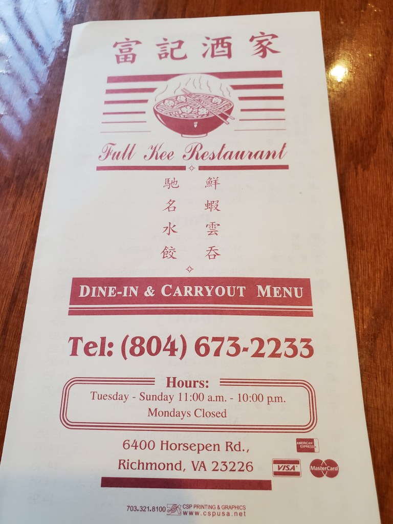 When I perused various best-of lists for Richmond restaurants in preparation for the trip, one Chinese restaurant came up several times; Full Kee, which is in northwest Richmond, about 15 minutes from our hotel in an area with numerous Asian restaurants and businesses.