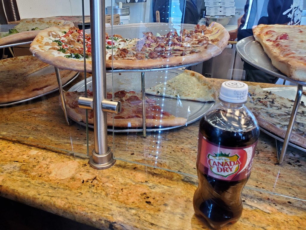I had ordered a cheesesteak with American cheese and fried onions from the car. While waiting for it after my arrival, I grabbed a black cherry wishniak from the soda case and checked out the pizzas that were on display with the notion of adding a slice to my sandwich.