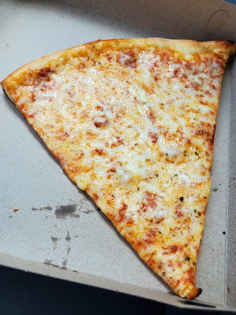 Although I only ordered one slice of pizza, it came in a small box rather than on a paper plate. That made it easier to transport out to the car with the other stuff I had in my hands. When I opened the box, my jaw probably dropped a bit over the size of the slice. It was huge, although I’m not sure how clearly that comes through in the photo below. I should have put one hand next to it while taking the shot with the other.