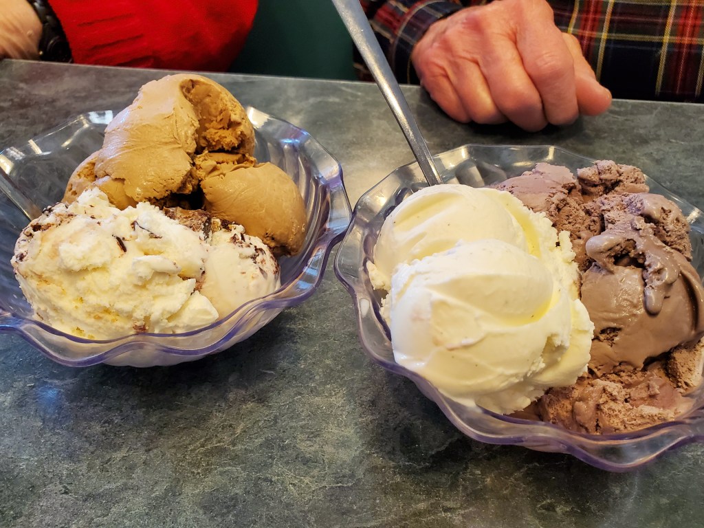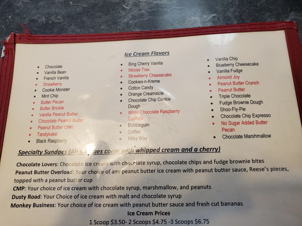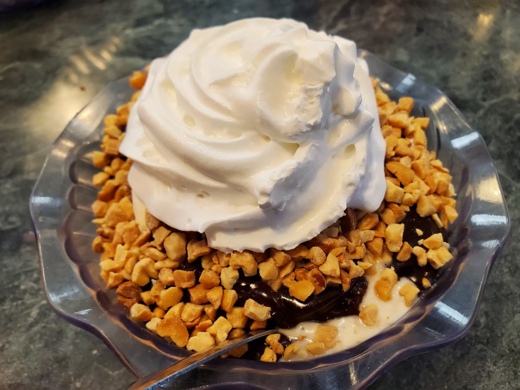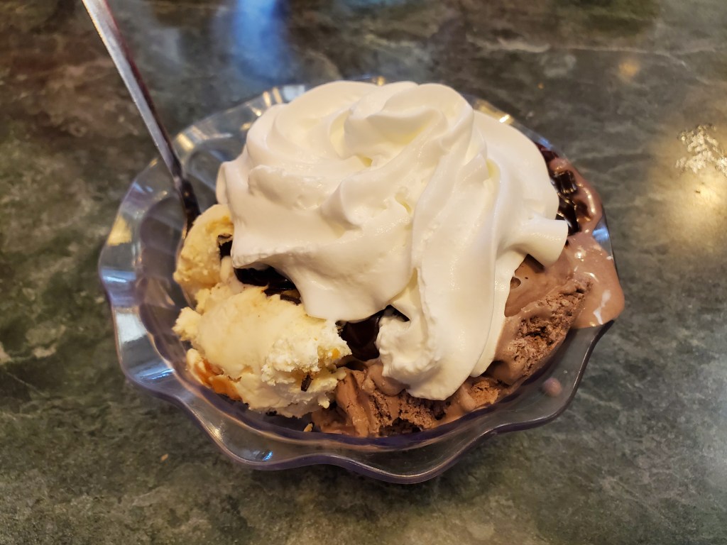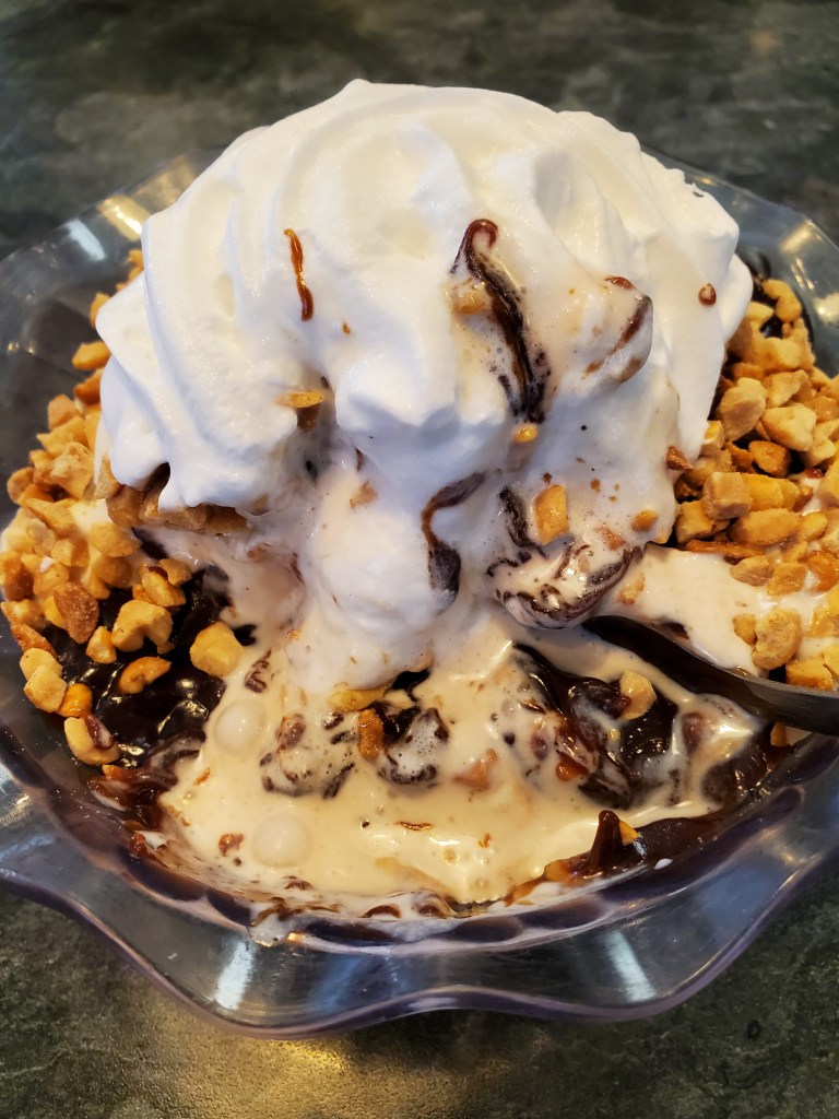 My wife and I both opted for hot-fudge sundaes. She had hers with black raspberry and tandykake ice creams – the latter named after one of Tastykake’s most popular snack cakes.