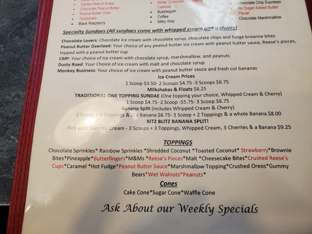 One of Ritz’s claims to fame is its fountain service. They offer roughly 40 flavors of ice cream and a full array of toppings for sundaes.