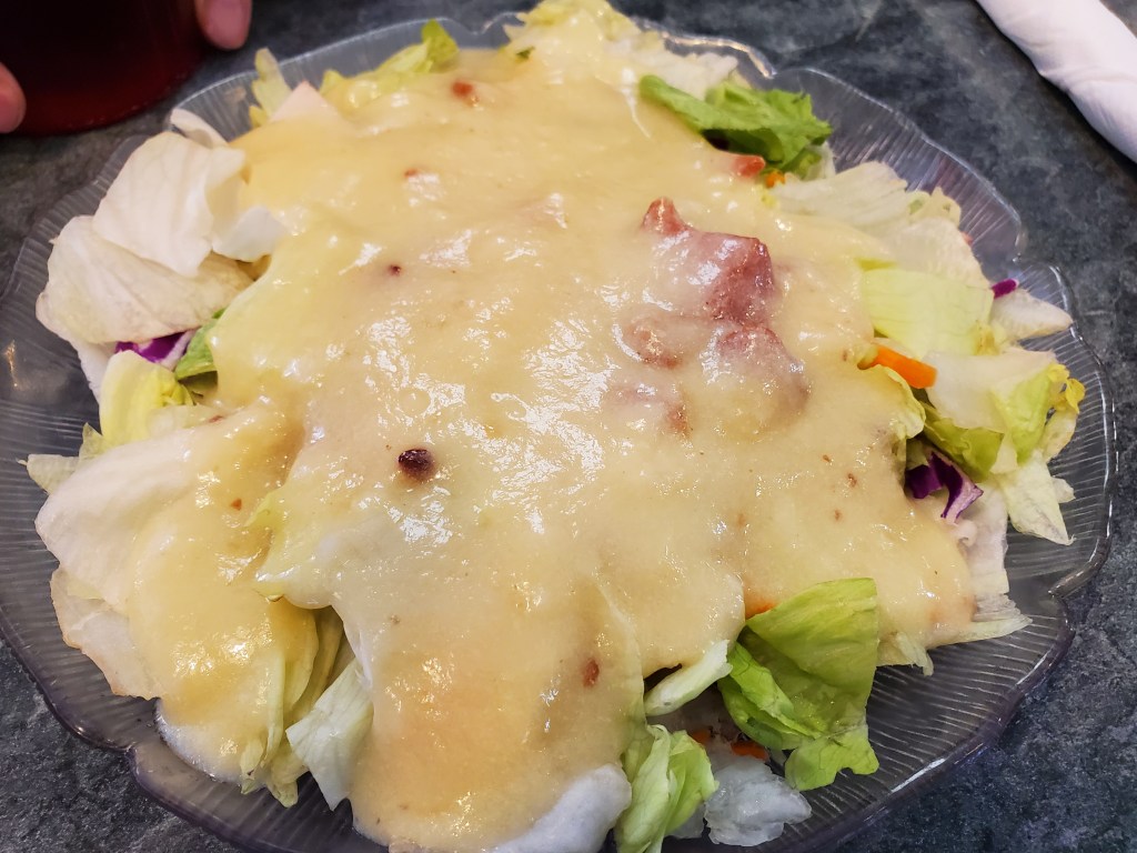 Ritz has a pot-pie of the week and it was beef when we were there. My father-in-law was enticed enough to go in that direction. It appeared to basically be beef stew inside a thick pie crust. His comments indicated that he was more impressed by the crust than the stew within. His meal also came with a salad topped with the house warm bacon dressing.