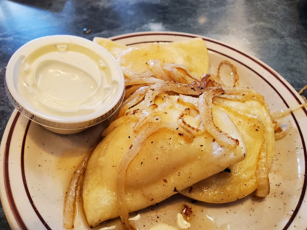 The potato cakes were perfectly crispy and went well with the apple sauce that accompanied them, while the perogies were filled with mashed potatoes and came with sautéed onions and sour cream.