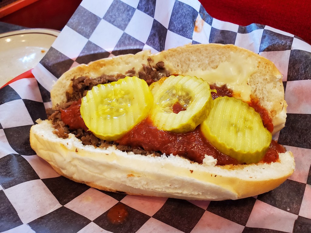 In the Lehigh Valley, cheesesteaks often come topped with tomato sauce unless requested otherwise. And that was the case with the one my mother-in-law ordered at Ritz Barbecue. It also came with pickles in addition to fried onions. As you can see in the photo below, it bears little resemblance to the cheesesteaks I normally write about.