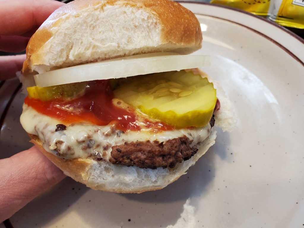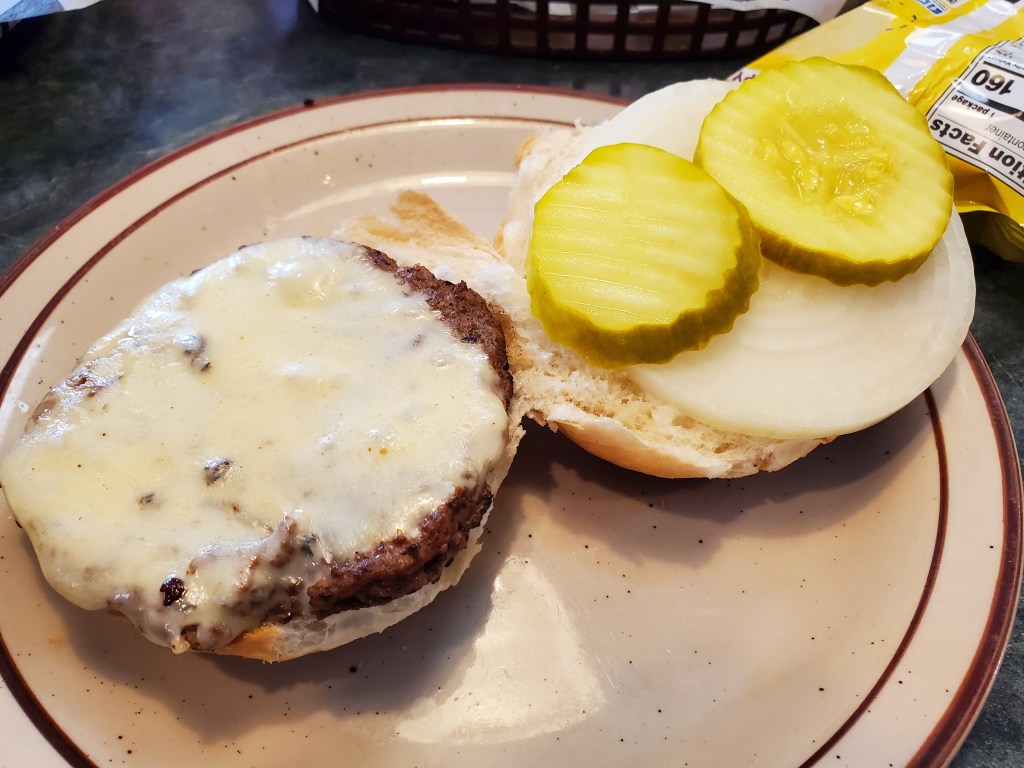And with that in mind, I ordered the smaller of their two burger sizes at a quarter-pound. It was a fairly big burger in terms of circumference, but it was also very thin. I would guess it dropped down to less than four ounces while cooking.